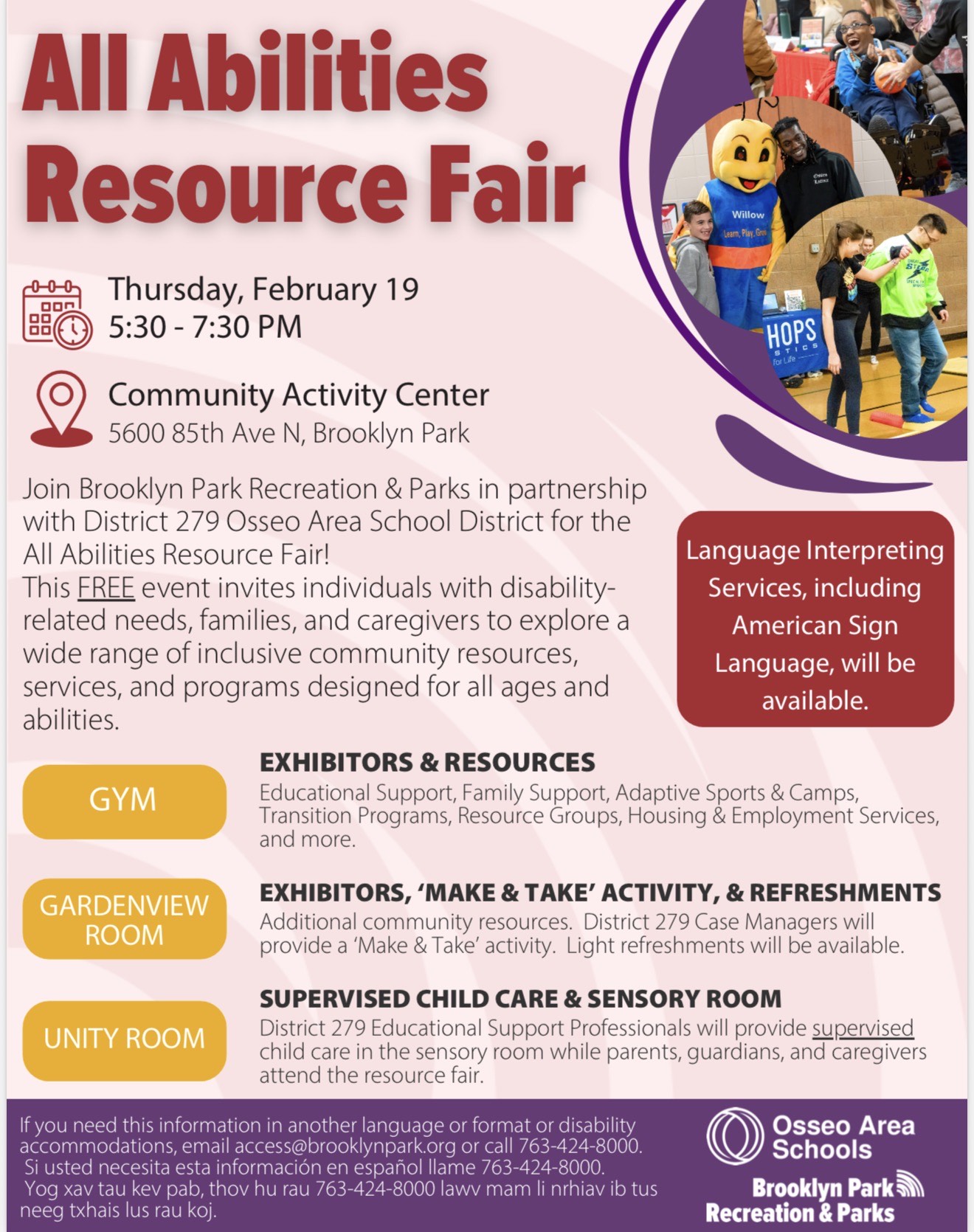 Explore resources in resources for housing, physical and mental health, employment, job training, college pathways, parenting and financial assistance. The Minnesota Disability Law Center will be tabling.